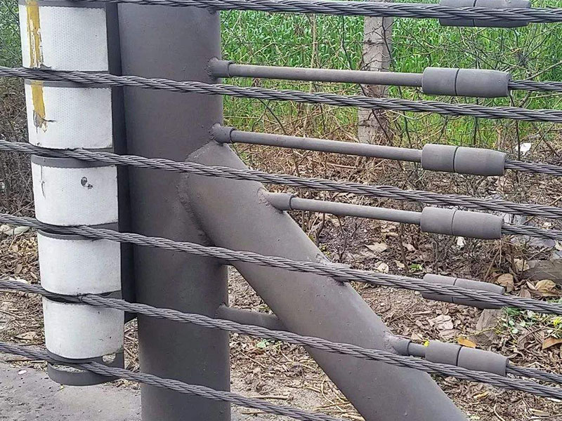纜索護(hù)欄的組成部分:纜索護(hù)欄立柱、纜索、纜索護(hù)欄中間立柱、托架等。纜索護(hù)欄中立立柱主要起到支撐纜索的作用。真正吃力的在纜索護(hù)欄兩端立柱,需要將纜索撐緊,這樣才能保證纜索護(hù)欄的有效防護(hù)。