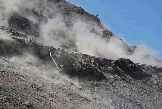 從這張圖片我們可以看到邊坡塌方直接中斷高速公路,而且高速公路上塵土飛揚,如果有汽車,汽車就會被土石直接吞沒。治理這種邊坡最有效的效果是安裝主動防護網,因為邊坡是土質邊坡安裝被動防護網是治標不治本的,土塊、碎石也同樣會滾落到高速公路上。